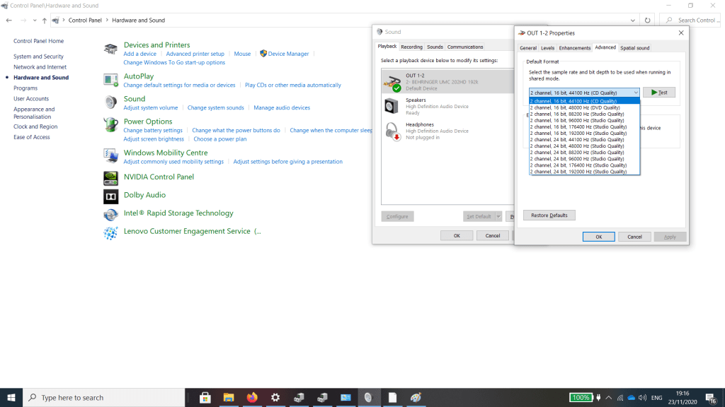 The problem is, that you have to do that every time there is a session with different sampling rate. There is a workaround which I have seen on a couple of forums. You can route the default audio out (using the motherboard’s own soundcard) into your interface input, but for that you have to determine what software is using what engine (as one engine only can handle one kind of sample rate). You can access this menu by right-clicking on the little speaker icon in the bottom-right corner for Settings, then click on Advanced Sound Options (bottom of the screen), which brings up the menu for “App volume device preferences”. Madness….. You can select the appropriate sound engines for your major applications.