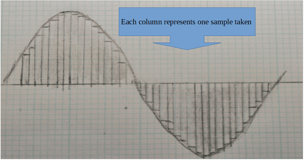For converting an analogue soundwave`s infinitely accurate values into (near) exact binary data as close as possible, an “analogue to digital converter” (ADC) needs to be used. This is essentially an electronic circuit, which repeatedly samples and measures the voltage of an analogue signal at given equal time periods
