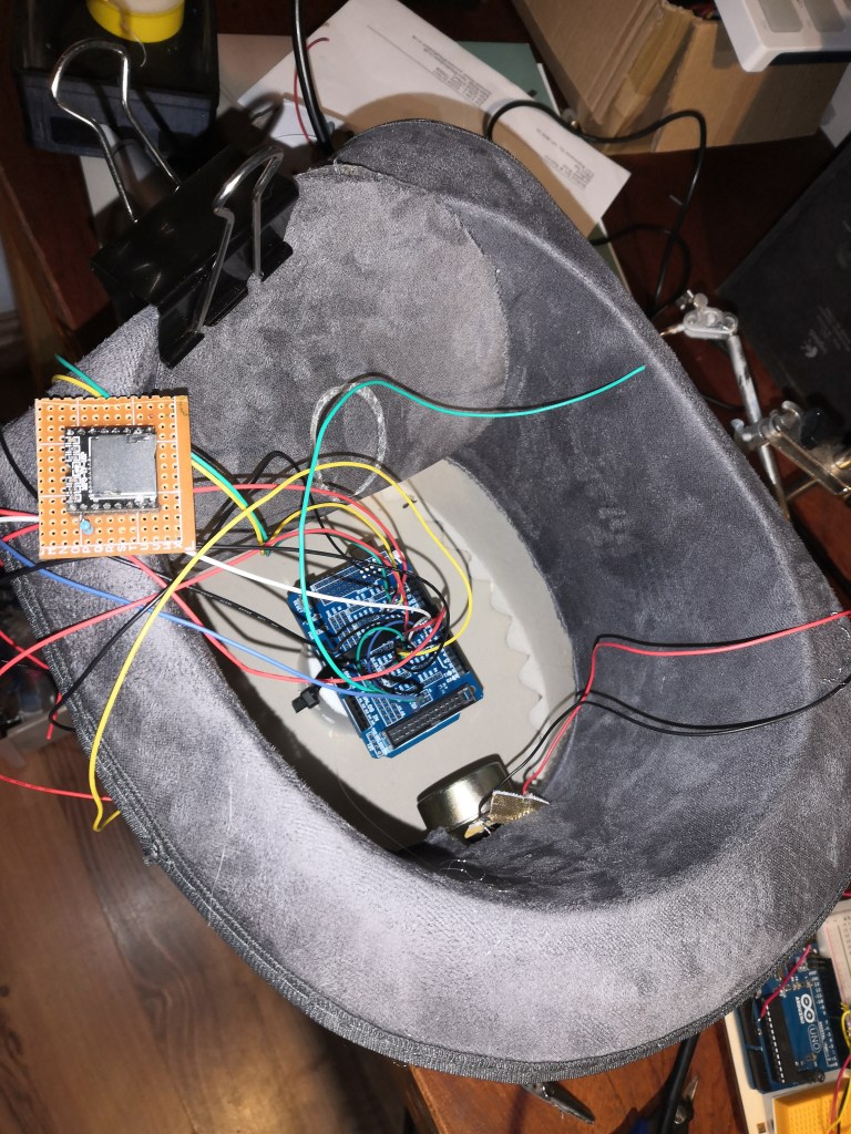 The build consisting of the hat and all electronics housed within. The system was build using a humble Arduino Uno which controls three things: